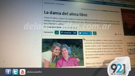 Con el título de 'La dama del alma libre' el Diario La Nación publicó, el fin de semana, una entrevista con la pigüense, en la que dice "tiene 53 años, y hace 30, padece esclerosis lateral amiotrófica y vive en la Fundación Salud; aunque sólo puede mover un dedo y los ojos, ella dice que gracias a su cuerpo encadenado, pudo liberar su alma".
