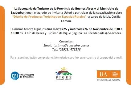 La Secretaría de Turismo de la Provincia de Buenos Aires está convocando a una capacitación sobre 'Diseño de productos turísticos en espacios rurales' que estará a cargo de la Licenciada Cecilia Camou.