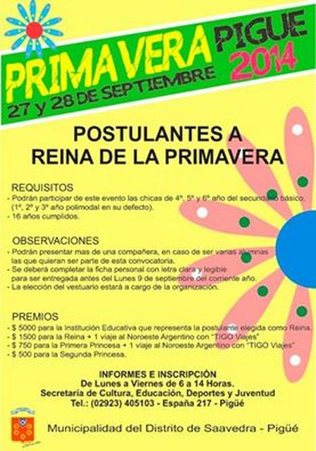 La Secretaría de Cultura, Educación, Deporte y Juventud extendió hasta el viernes la inscripción para las instituciones de Pigüé y el Distrito que deseen emplazar una cantina durante el desarrollo de la Fiesta de la Primavera.