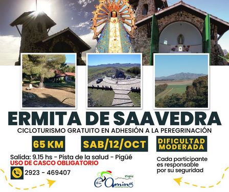 Este sábado, a las 9.15 horas, desde la Pista de la Salud, en Pigüé, quienes quieran sumarse podrán hacerlo para peregrinar en bicicleta hacia la Ermita Nuestra Señora de Luján de las Sierras de Saavedra.