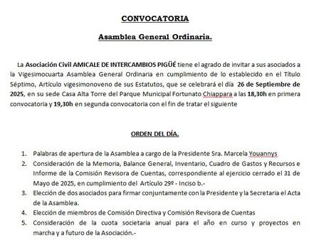 Amicale de Intercambio estará realizando, con el tratamiento de los puntos que figuran en el Orden del Día, su Asamblea General Ordinaria.