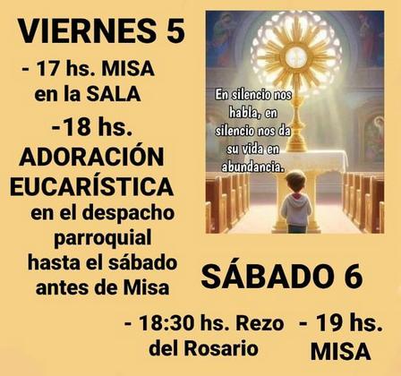 La misa se llevará a cabo luego de las 17.00 horas en la Sala Hogar, mientras que, luego de las 18.00 horas, dará inicio la adoración, en el Despacho Parroquial, hasta minutos antes de la celebración anunciada para mañana.