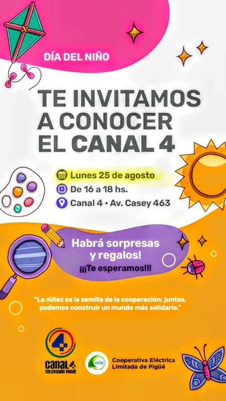 Canal 4 TV Pigüé abrirá sus puertas para celebrar el Día del Niño con sorpresas y regalos.