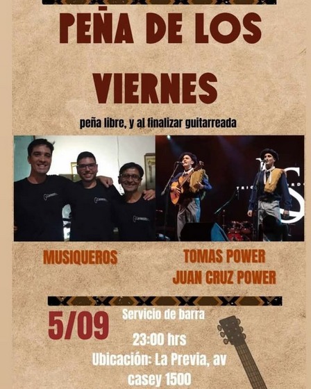 El viernes 5 de septiembre, en Avenida Eduardo Casey al 1.500, habrá peña libre, y al finalizar, guitarreada.