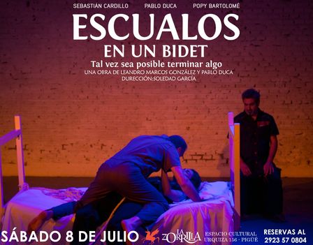 El sábado 8 de julio, a las 21.00 horas, en la sala de calle Urquiza 156 de la ciudad, se presentará la obra bahiense 'Escualos en un bidet', protagonizada por Popy Bartolomé, Sebastián Cardillo y Pablo Duca.