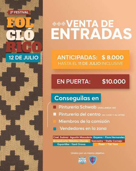 La 2º edición del festival folclórico tiene anticipadas, a 8.000 pesos, en venta, en Pinturería del Centro, Pinturería Schwab, con vendedores habilitados en distintas localidades, y a través de la Comisión Directiva de las instituciones organizadoras.