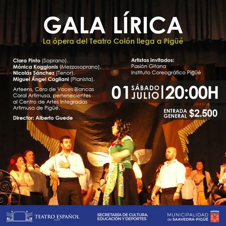 La ópera del Teatro Colón estará llegando a Pigüé para el día sábado 1 de julio, a las 20.00 horas, contando con la dirección de Alberto Guede, y las voces de Clara Pinto, Mónica Koggianis, Nicolás Sánchez, y Miguel Ángel Cagliani.