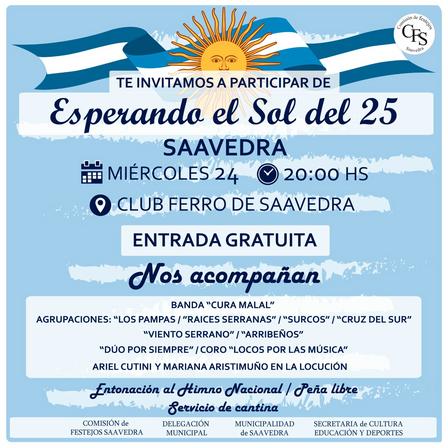 Mañana, miércoles 24 de mayo, tendrá lugar la Peña ‘Esperando el Sol del 25’, con entrada libre, en el salón del Ex Club Ferro.