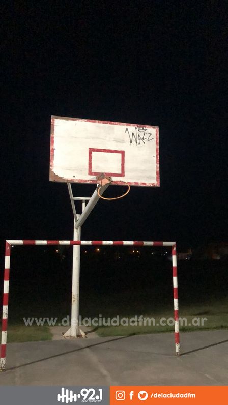 Uno de los dos aros de ese playón polideportivo es el que está roto.