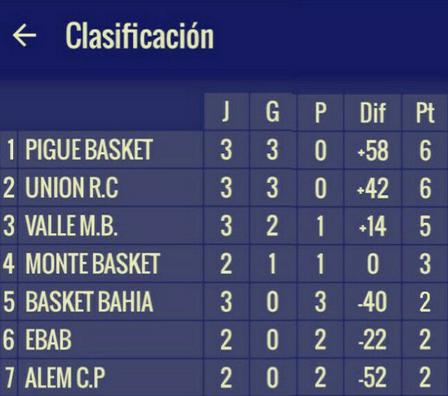 Pigüé Basket está igualado, con seis puntos, con Unión RC, seguido de Valle Medio Básquet que suma 5, y luego aparecen Monte Básket con 3, y con dos unidades Básket Bahía, EBAB, y Alem CP.