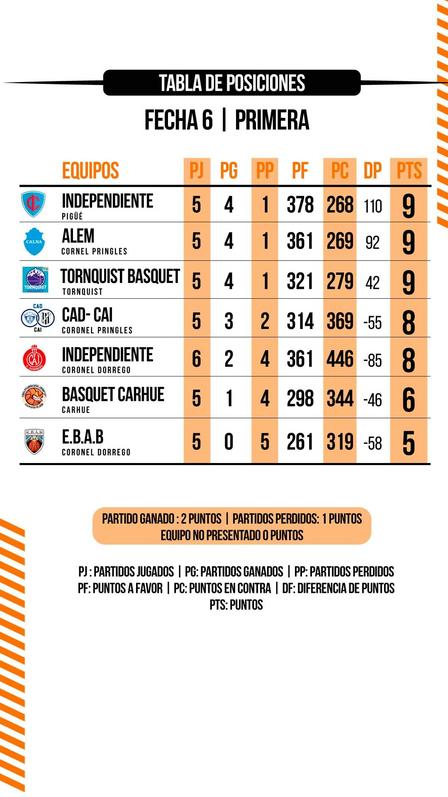 En el Gimnasio Francisco Cervera el Club Independiente de Pigüé recibirá a la Primera División de Carhué Basquet.