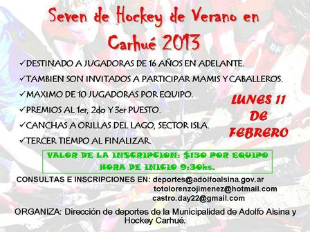 El lunes próximo, haciendo uso del feriado, desde las 9.30 horas, la Dirección de Deportes, junto a Hockey Carhué, hará un certamen de hockey para deportistas de 16 años en adelante provenientes de distintas localidades de la región.