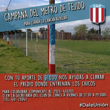 La campaña del metro cuadrado para la compra de alambrado perimetral recibe aportes al 2923 43 37 03 o bien en la Secretaría del Club Unión, de lunes a viernes, de 17.30 a 19.30 horas.