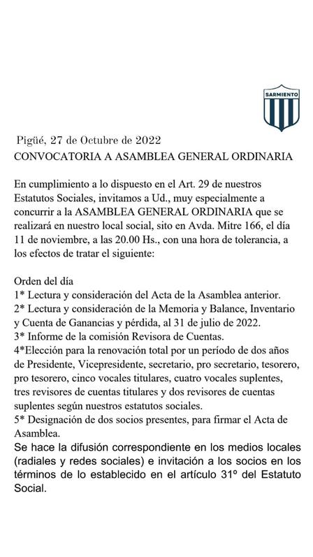 Club Sarmiento de Pigüé ya estableció el detalle del orden del día a tratar en la Asamblea General Ordinaria.