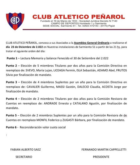 La institución deportiva local está llamando a sus asociados a una Asamblea General Ordinaria prevista para el día de hoy, viernes, 23 de diciembre, a las 21.00 horas, en la sede social ubicada en calle Sarmiento 51 de Pigüé.