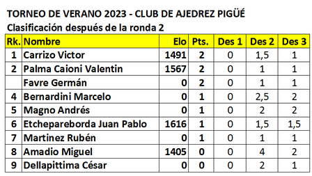 En el Torneo de Ajedrez de Verano, con 1 punto, están Marcelo Bernardini, Andrés Magno, Juan Pablo Etchepareborda y Rubén Martínez, mientras que, sin unidades están Miguel Amadío y César Dellapittima.