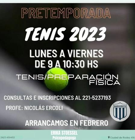 De 9.00 a 10.30 horas, de lunes a viernes, hay actividad de tenis y preparación física en el predio del Club Sarmiento de Pigüé.