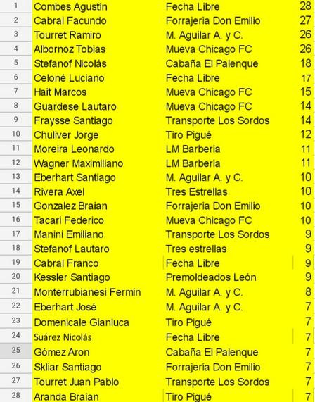 Con 28 tantos el líder es Agustín Combes, seguido por Facundo Cabral con 27, y por Ramiro Tourret con 26 al igual que Tobías Albornoz.