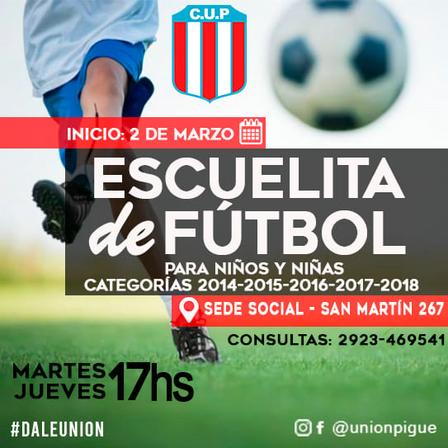La Escuelita de Fútbol del Club Unión Pigüé estará comenzando sus prácticas el 2 de marzo, con clases los días y jueves, a las 17.00 horas.