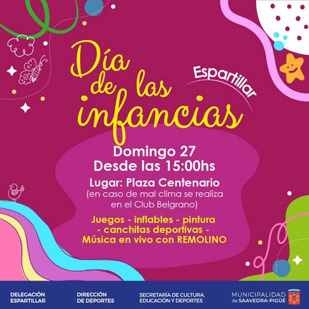 El domingo 27 de junio, a las 15.00 horas, las celebraciones por el Día de las Infancias continuarán, en la Plaza Centenario de Espartillar.