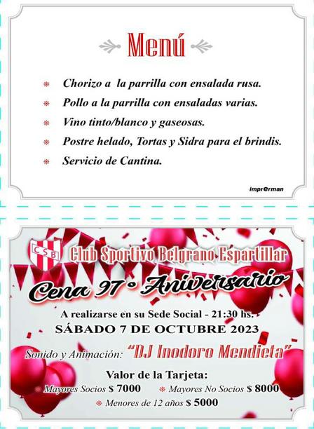 Belgrano de Espartillar avanza con la venta de tarjetas de su Cena Aniversario