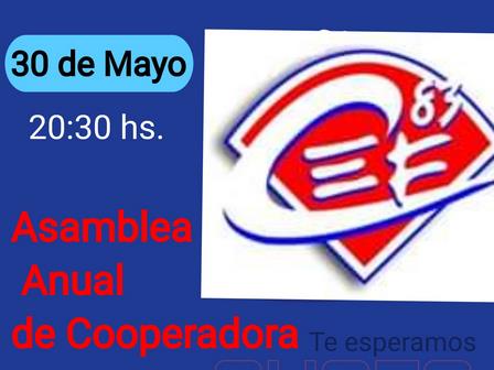 Este jueves, 30 de mayo, a partir de las 20.30 horas, se realizará la Asamblea Anual Ordinaria de la Asociación Cooperadora.