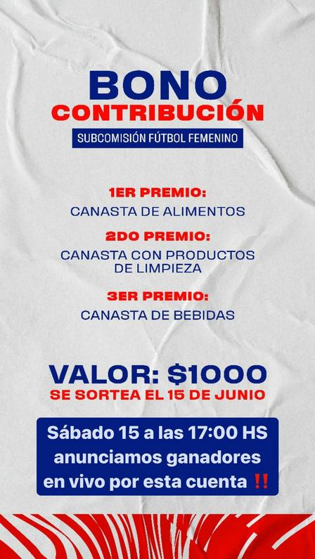 Para sortearse el día 15 de junio, por un valor de 1.000 pesos, aún hay números disponibles del Bono Contribución organizado por la Sub Comisión de Fútbol Femenino de la institución azulgrana.