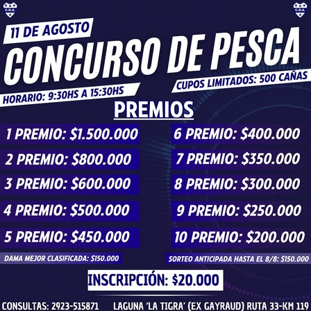 Para este evento en Laguna La Tigra, ubicada en Ruta 33 kilómetro 119, ya están venta las entradas del Concurso de Pesca del Club Deportivo Argentino.