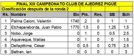 El certamen que consagrará al Campeón del Club de Ajedrez Pigüé tiene en la cima a Valentín Palma Caioni luego de haber vencido a Ian Beltrán con piezas negras en 30 movimientos de una Defensa Escandinava