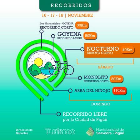 El fin de semana del sábado 16, domingo 17, y lunes 18 de noviembre, habrá salidas a Los Manantiales - Goyena, con 30 kilómetros de recorrido corto, y 80 kilómetros de trazado largo, a su vez, tendrá desarrollo una actividad nocturna con 40 kilómetros en bicicleta por la zona de Arroyo Corto.