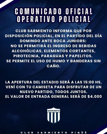 Club Sarmiento dio detalles del ingreso al Estadio para el partido del domingo ante Boca