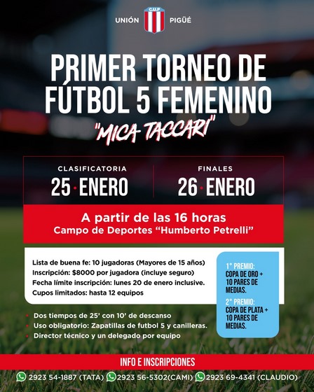 Club Unión Pigüé ya está inscribiendo a los equipos interesados en sumarse a través del 2923 54 18 87, del 2923 56 53 02, y del 2923 69 43 41.