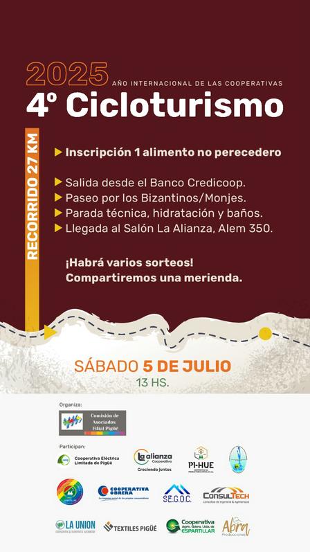 El 4ª Cicloturismo por el Día de las Cooperativas se hará en Pigüé