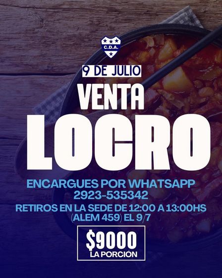 Para el locro, que tiene un valor de 9.000 pesos la porción, los retiros se llevarán a cabo en la Sede Social, ubicada en calle Leandro N Alem 459 de Pigüé, de 12:00 a 13:00 horas, el día miércoles 9 de julio.