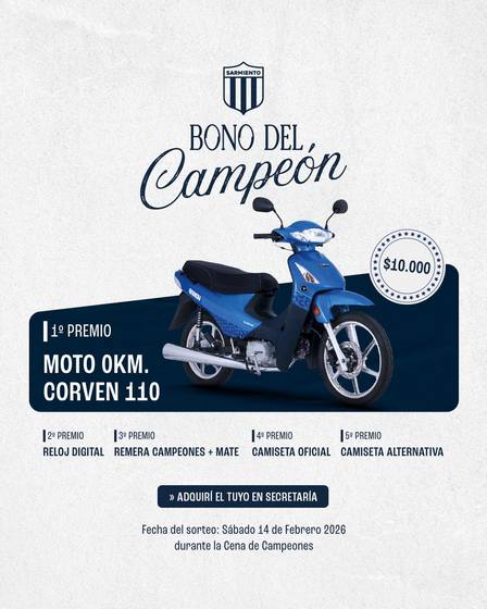 Una moto Corven 110 cc. 0 KM es el primer premio, el 2° un reloj digital, el 3° la remera de Campeones + 1 mate, el 4° la Camiseta Oficial, y el 5° una Camiseta Alternativa.