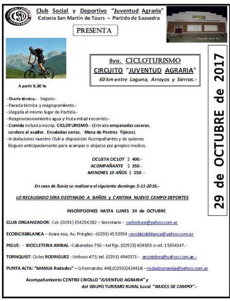 El 29 de octubre se llevará a cabo el Octavo Cicloturismo en el Circuito de Juventud Agraria combinando pasadas por arroyos, lagunas, y sierras.