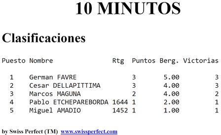 Germán Favre se quedó con el torneo a 10 minutos disputado en el Club de Ajedrez venciendo, en primera ronda, a Etchepareborda, en segunda ronda a Dellapittima, cedió en tercera ante Maguna y luego derrotando en la cuarta ronda a Amadio.