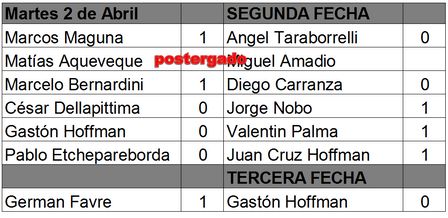 Marcos Maguna que con su tradicional peón dama, superó en 40 movimientos a Angel Taraborrelli, Germán Favre que venció a Gastón Hoffman con piezas Blancas, Juan Cruz Hoffman que derrotó a Juan Pablo Etchepareborda con piezas negras en 33 movimientos de una Defensa Francesa y Valentín Palma que dio cuenta de Gastón Hoffman con piezas negras en 30 movimientos de una defensa holandesa, quedaron al frente del Torneo Oficial.