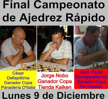 Oscar Javier Chávez Dorado se quedó con el Blitz de Diciembre, último torneo oficial del Club de Ajedrez, el ganador sumó 4 puntos perdiendo únicamente ante Etchepareborda. El segundo lugar fue para Jorge Nobo que sumó tambien 4 puntos pero perdió el desempate por sistema olímpico ya que la partida que jugaron entre ambos fue ganada por Chávez, tercero quedó Pablo Etchepareborda con 3 pts, cuarto César Dellapittima con 3 pts., quinto Marcos Maguna con 3 pts., Sexto Alfredo Cabrelles con 2 pts., y séptimo Miguel Amadío con 1 pt.