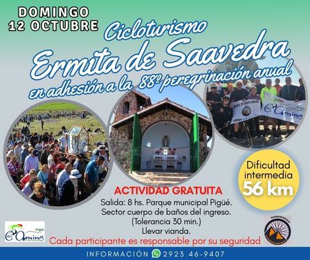 El día domingo 12 de octubre, a las 8.00 horas, desde el Parque Municipal Fortunato Chiappara de Pigüé, quienes quieran sumarse podrán hacerlo para peregrinar en bicicleta hacia la Ermita Nuestra Señora de Luján de las Sierras de Saavedra.