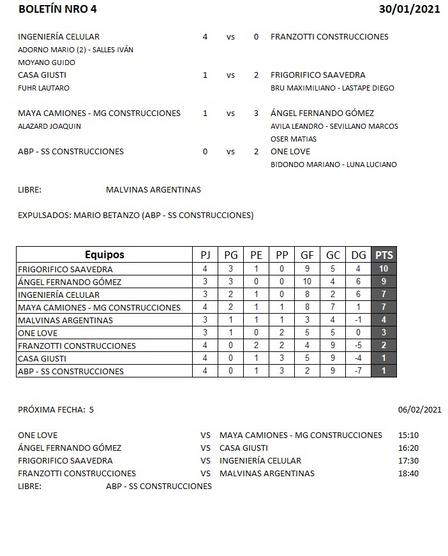El Rinconcito & Mandale Fruta 1 vs. FG Electromecánica 4 - En FG llegaron al gol Fernando Ortiz, Daniel Poncela, Sebastián Deni y Francisco Pineda. El equipo derrotado tuvo la marca de Carlos Díaz