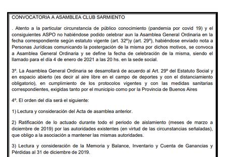 El mensaje de la entidad deportiva expresa "atento a la particular circunstancia de público conocimiento (pandemia por covid 19) y el consiguiente ASPO no habiéndose podido celebrar aun la Asamblea General Ordinaria en la fecha correspondiente según estatuto vigente (art. 32º)y (art. 29º), habiéndose enviado nota a Personas Jurídicas comunicando la postergación de la misma por dichos motivos, se convoca a Asamblea General Ordinaria y se define la fecha de celebración de la misma, siendo el llamado para el día 4 de enero de 2021 a las 20 hs. en la sede social.