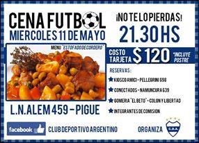 El miércoles 11 de mayo, a las 21.30 horas, se hará una cena de fútbol en el Club Deportivo Argentino.