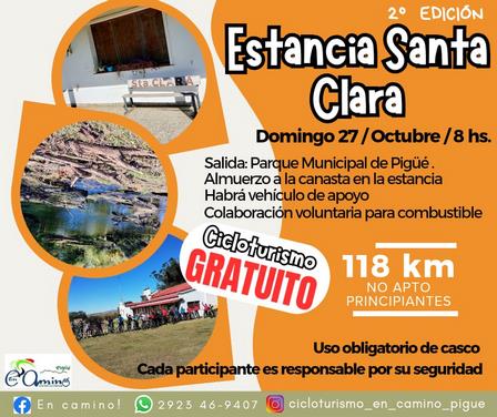 El día domingo 27 de octubre, a las 8.00 horas, partirán quienes quieran participar de la visita al Establecimiento Rural Santa Clara tras surcar por paisajes del Abra del Hinojo en la zona serrana del Distrito de Saavedra.