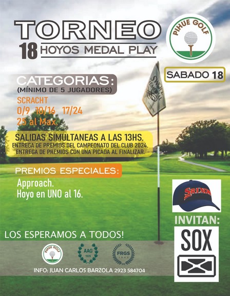 Un Torneo de 18 Hoyos será auspiciado por Sox en Pihué Golf.