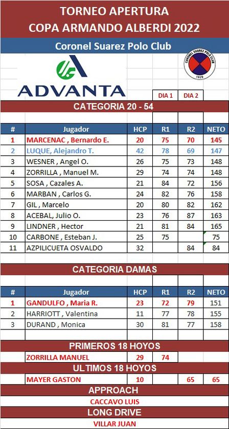 Fue Bernardo Marcenac quien tuvo las mejoras marcas, en el Coronel Suárez Polo Club, al quedarse con el 1 en la divisional 20 a 54.