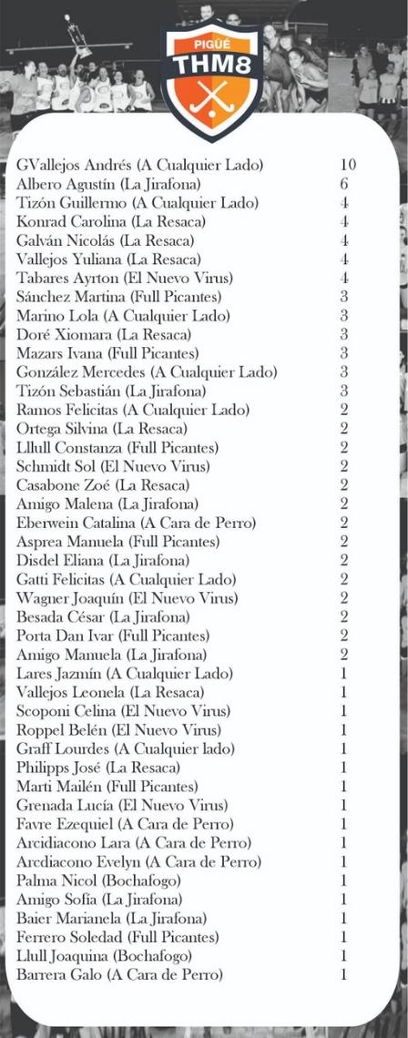 Con 7 tantos están Martina Sánchez y Agustín Albero, mientras que, con 6 goles aparecen Nicolás Galván y Ayrton Tabares.
