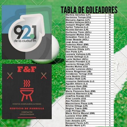 Martina Sánchez es la líder de la tabla de máximos anotadores del certamen con 14 unidades seguida por Gerónimo Temps con 13.