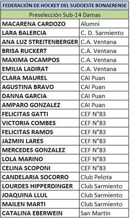 Dieron a conocer la lista preliminar del Seleccionado SUB 14 de hockey