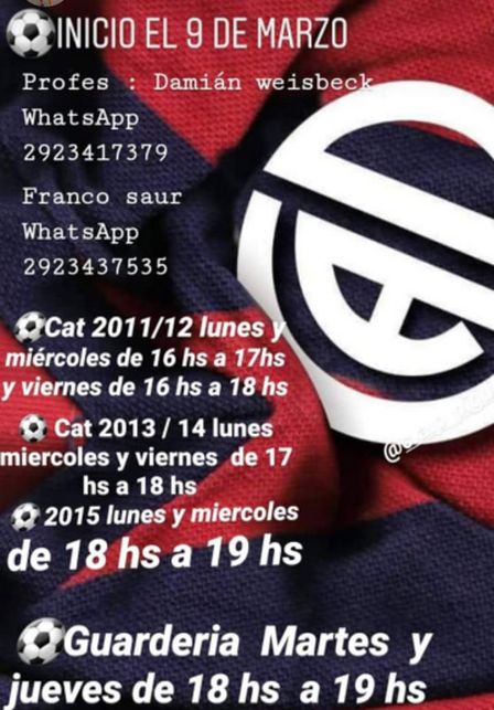 Los días miércoles de 16.00 a 17.00 horas, y los viernes, de 16.00 a 18.00 horas, tendrán clases los chicos de las Categorías 2011 y 2012, mientras que, los pequeños de las Categorías 2013 y 2014 lo harán los días lunes, miércoles, y viernes, de 17.00 a 18.00 horas.